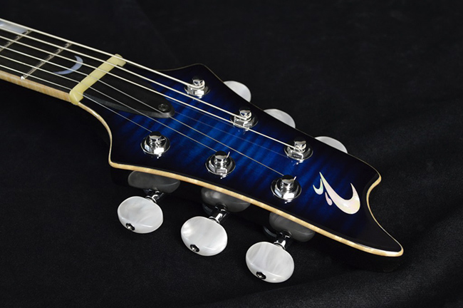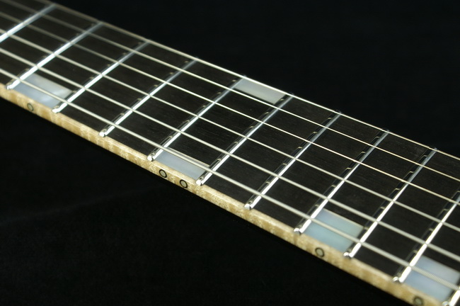 このモデルに選択されたフレットはJescar社のFW9665SS。ステンレススチールはなめらかでスピーディなフィンガリングに大きく貢献し、またサウンド面でもキラリとした倍音構成を味付けしてくれている。